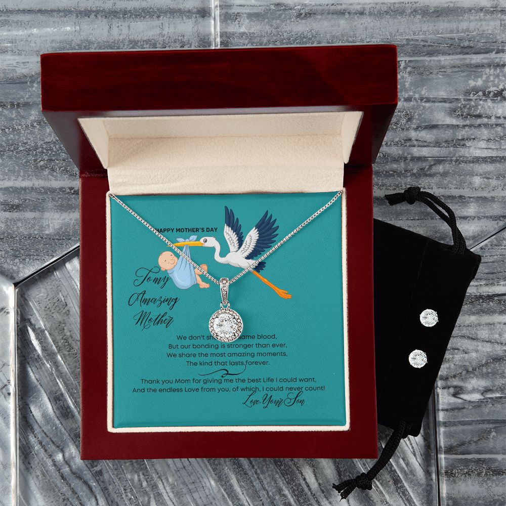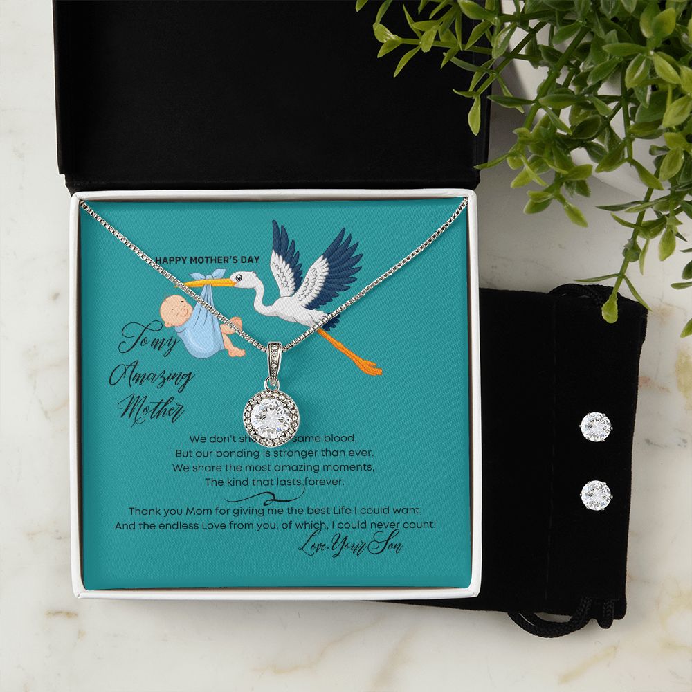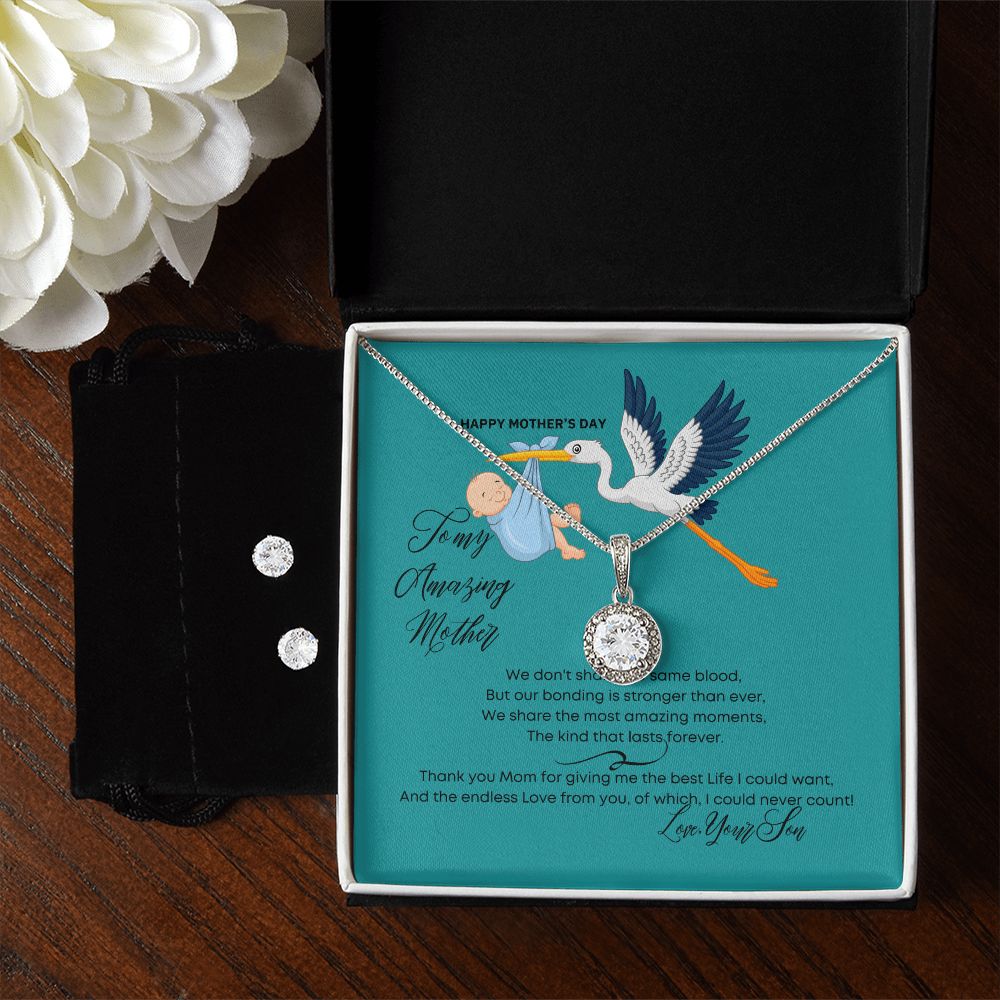 To My Amazing Adopted Mom - Eternal Hope Necklace & Clear CZ Earrings Set - Perfect Gift For Mom for Mother's Day - From her Son!