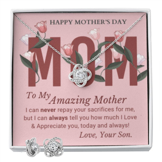 A mi increíble madre - Juego de aretes y collar Love Knot - ¡A ella le encantará este regalo! ¡Feliz día de la madre!