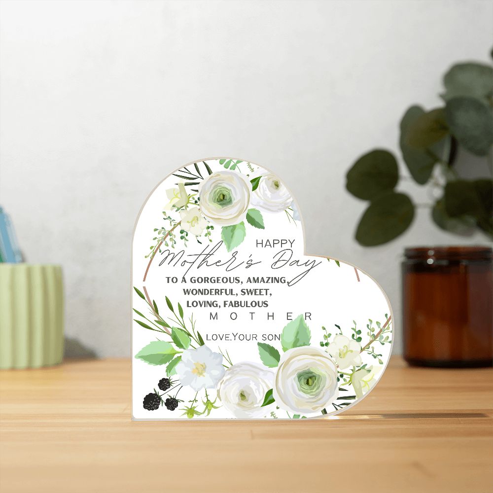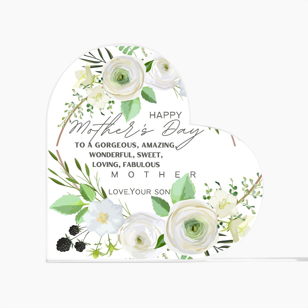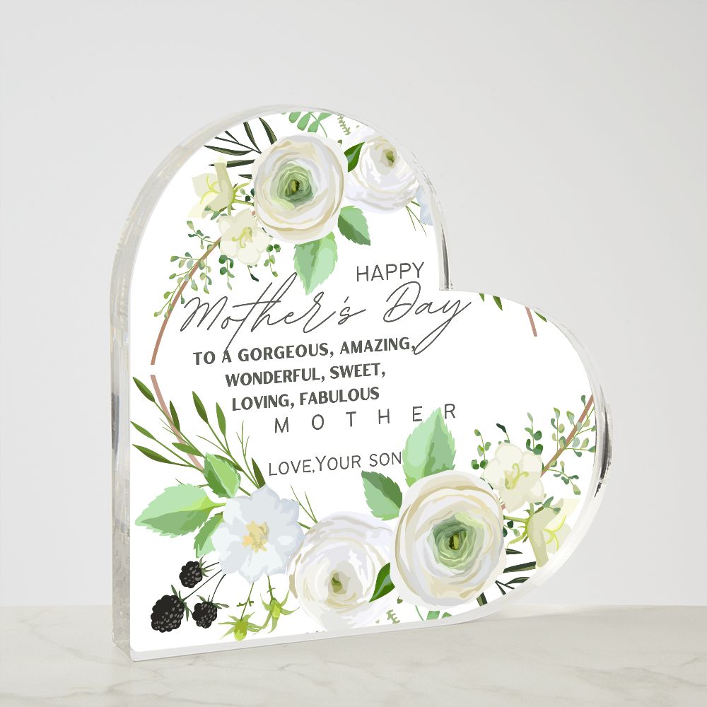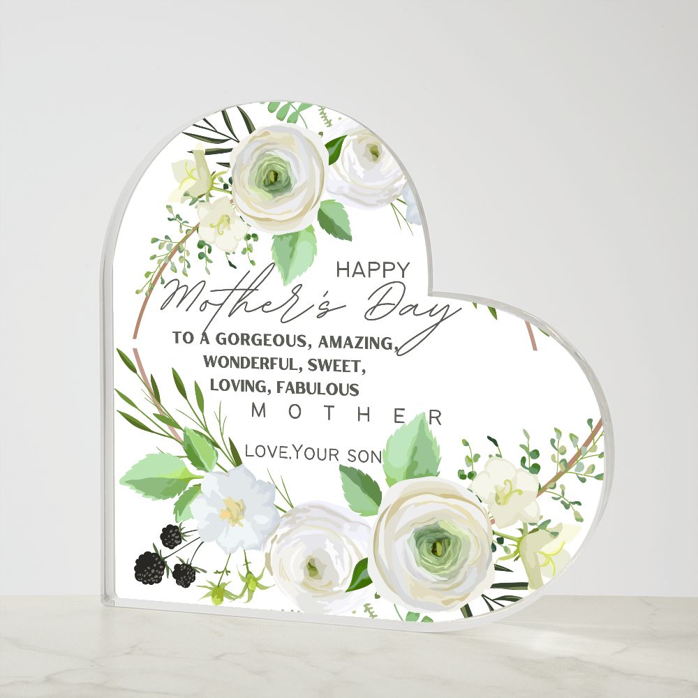 Esta placa acrílica en forma de corazón para tu mamá para el día de la madre, de su amado hijo.