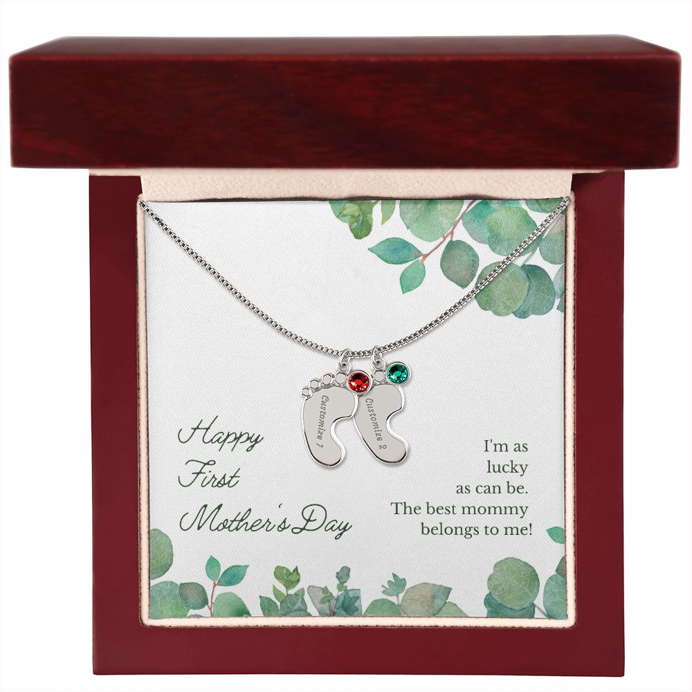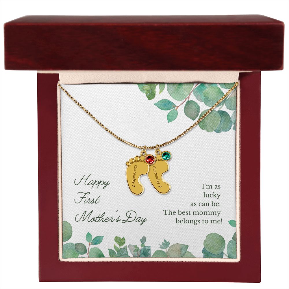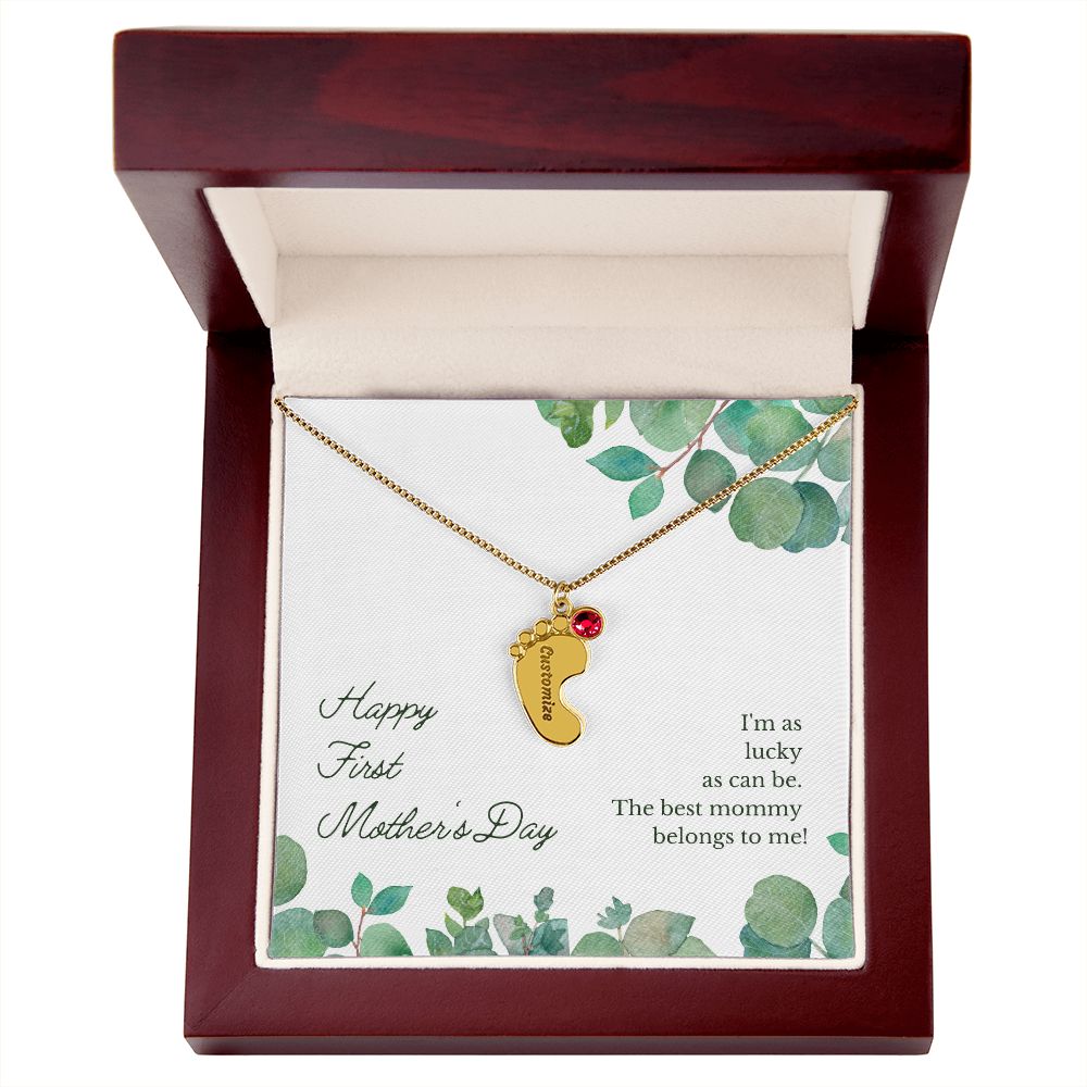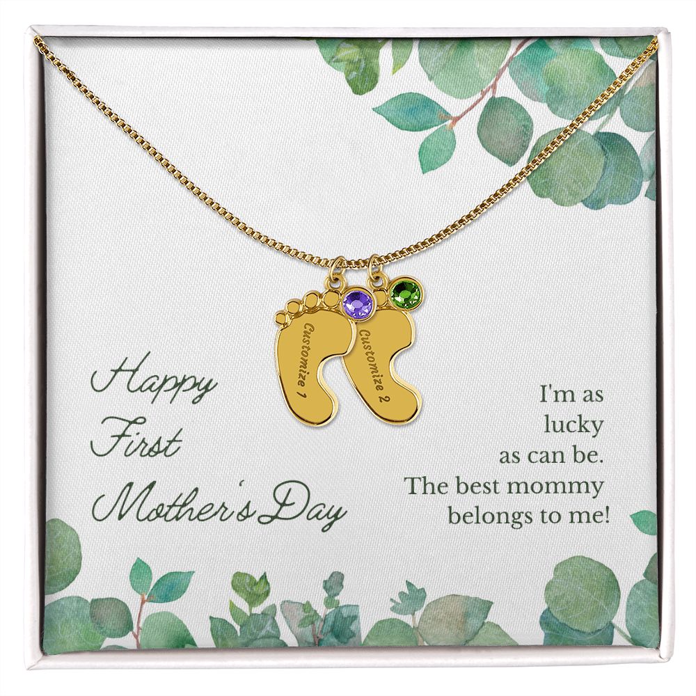 Happy First Mother's Day - PERSONALIZED Baby Feet Necklace with Birthstone - FOR MOM!